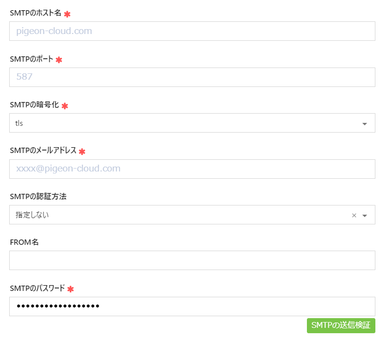 | SMTPの暗号化 | ご利用いただいているメールサーバーのSMTPの暗号化種別を選択します。「tls」「ssl」「無し」のいずれかを選択します。 |