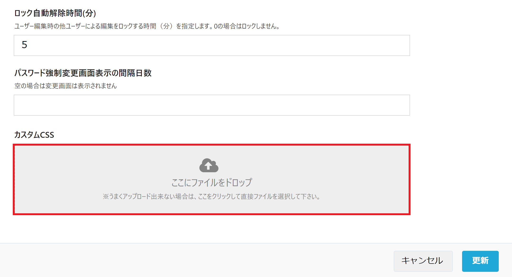 カスタムCSSの赤枠箇所へ該当のCSSファイルをドロップするか、クリックしてCSSファイルをセットします。