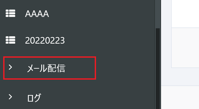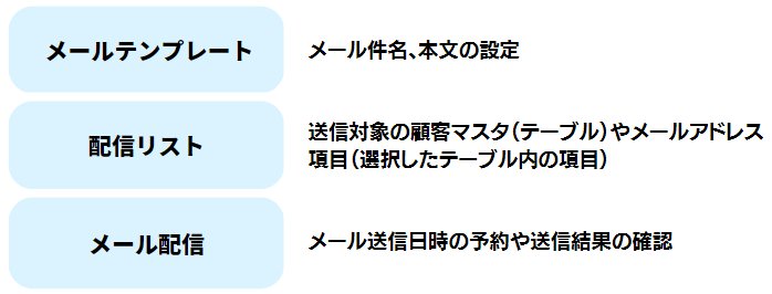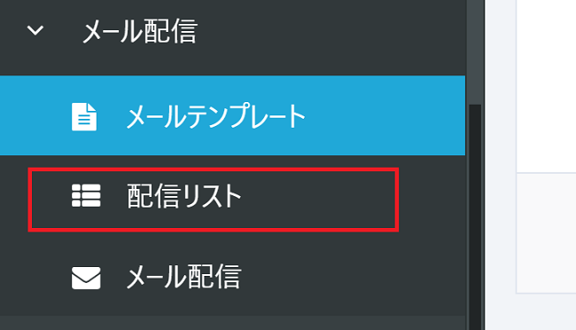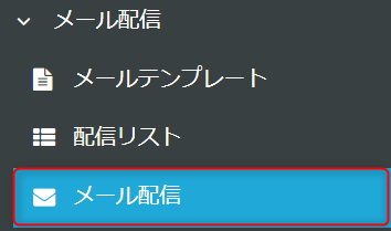 | メール配信 | メールの配信予約を行います。「メールテンプレート」/「予約日時」/「配信リスト」の設定が可能です。さらに、送信後は送信結果をここで確認することが可能です。 |