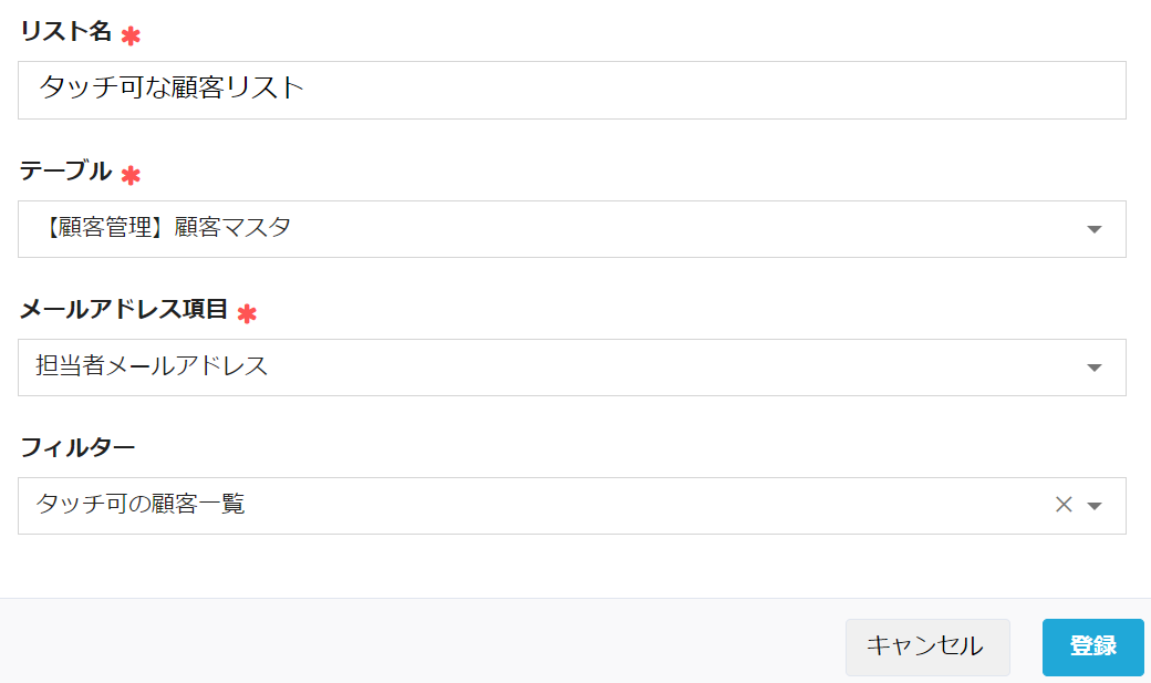 「リスト名」/「テーブル」/「メールアドレス項目」/「フィルター」を設定し「登録」ボタンをクリックします。