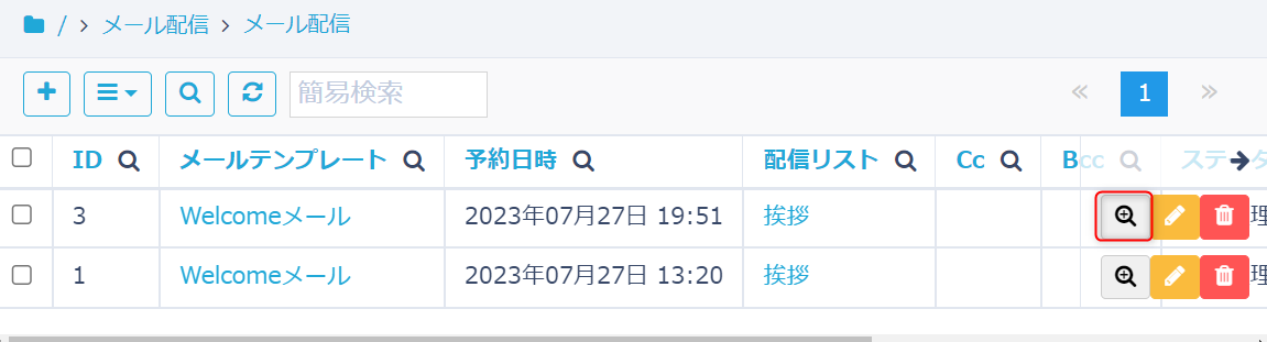 2. 配信結果を確認したいメールの「虫眼鏡」ボタンをクリックする