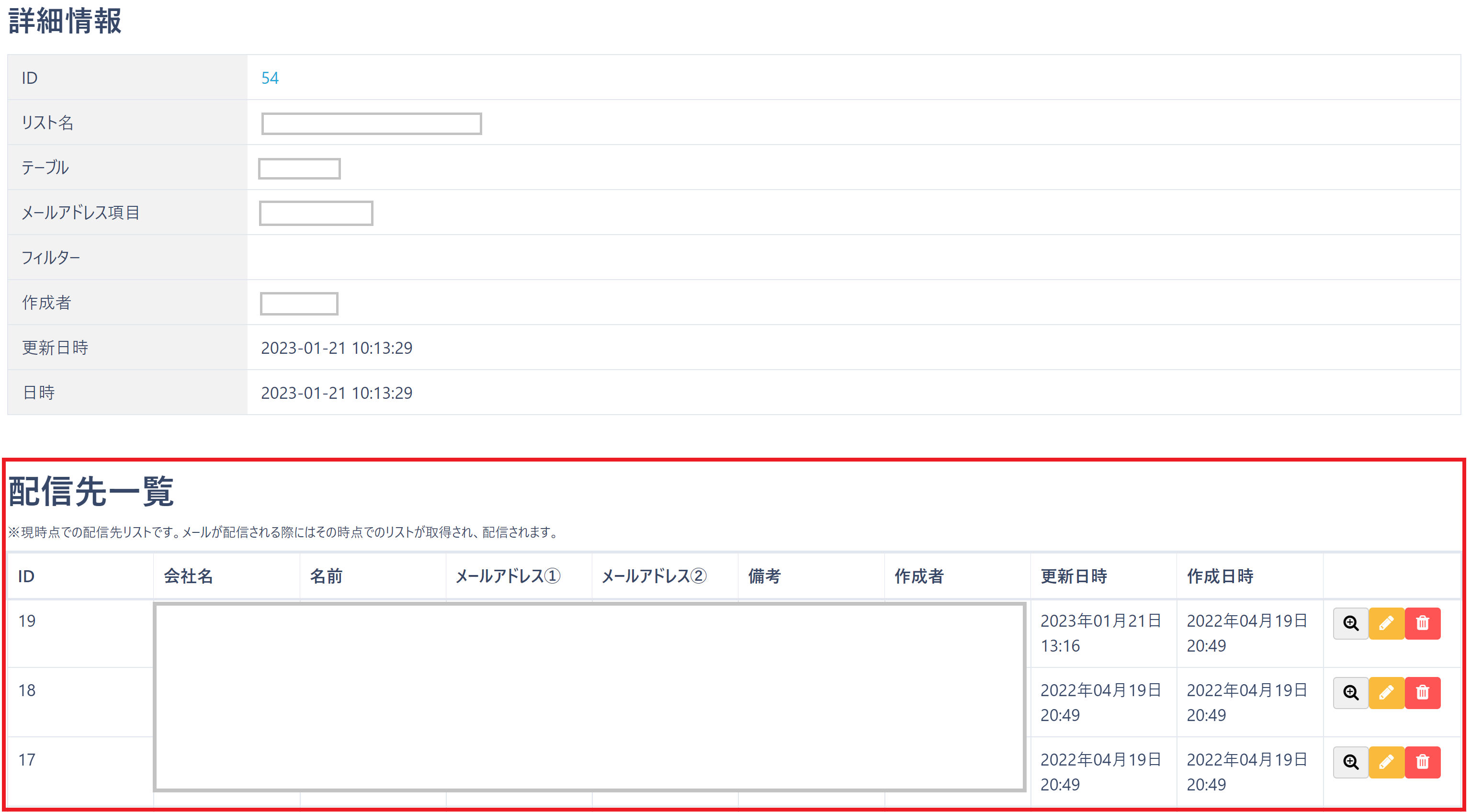 設定完了後、「配信リスト」一覧より、該当の「配信リスト」の詳細アイコン(虫眼鏡アイコン)をクリックすることで、「詳細情報」や「配信先一覧」の情報が確認できます。