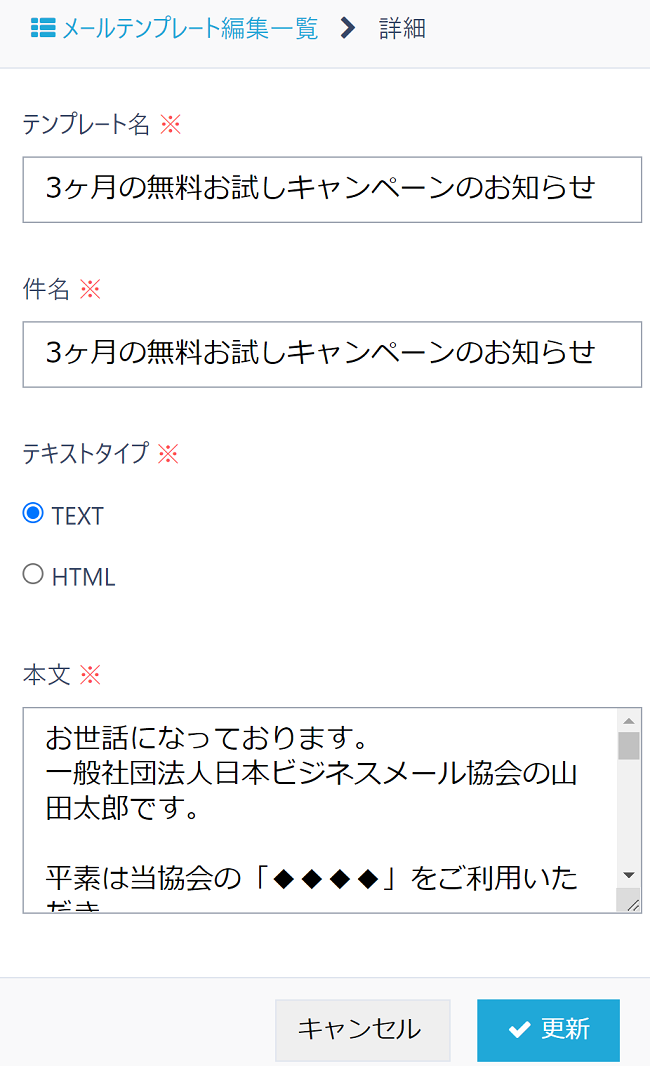 「テンプレート名」および配信メールの「件名」/「テキストタイプ」/「本文」を入力し設定を保存します。