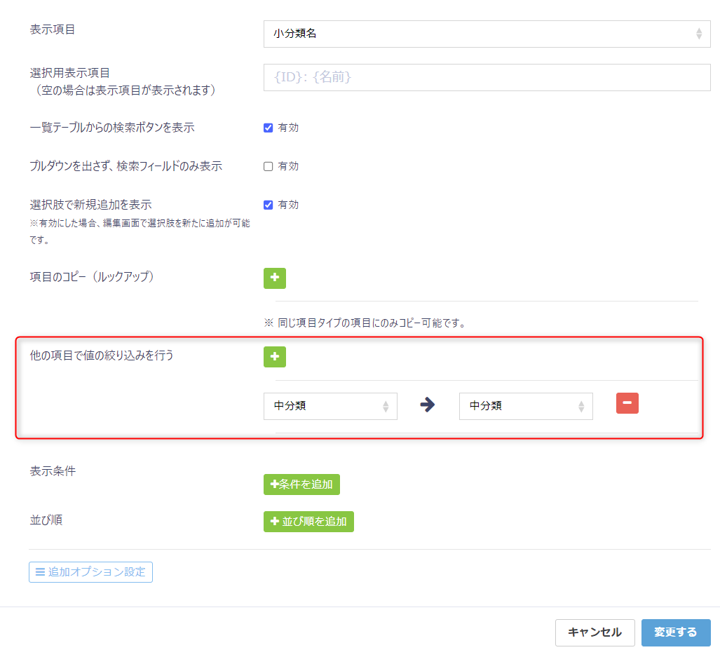 ここでは、先に選択した大分類によって紐づく中分類のみが絞り込み表示されるような設定を行います。