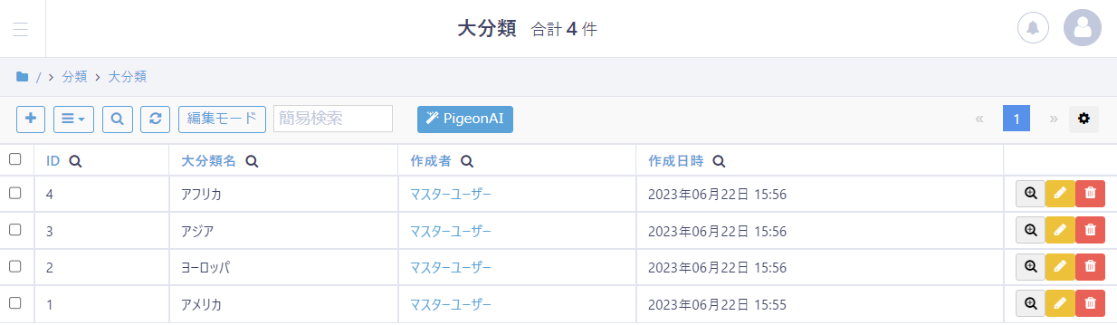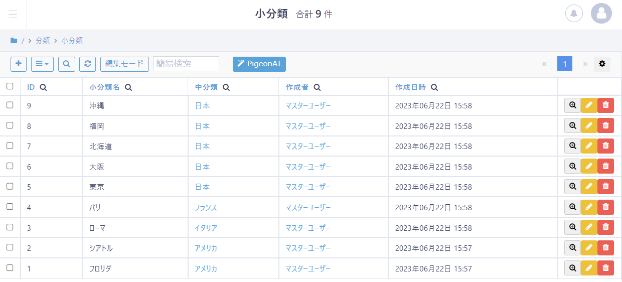 以下のレコードを追加するヘルプページを参考にしながら、以下のようにレコードを登録してみて、最後に「顧客マスタ」にて、大分類・中分類・小分類を選択してみてください。