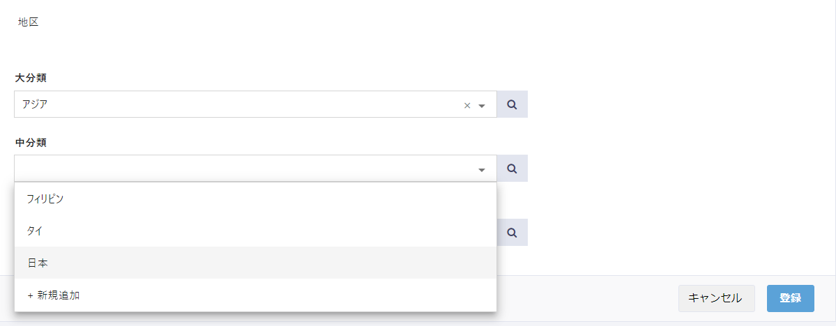 例えばエリア選択(大分類)でアジアを選択したら日本やタイ、フィリピン等、アジアに属する国の一覧が表示され、さらに国の選択(中分類)で日本を選択すると日本の都道府県が表示される、等のイメージです。