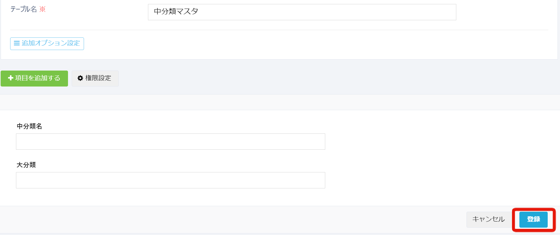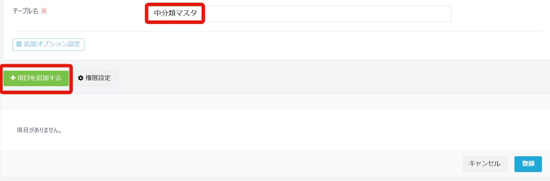テーブル名に「中分類マスタ」と入力し、「項目を追加する」をクリック。