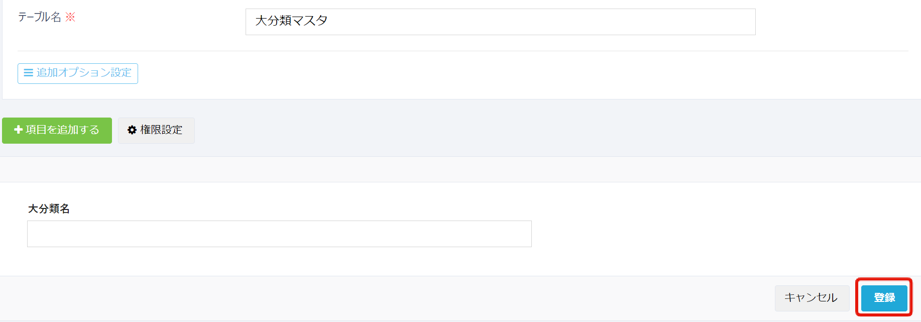 テーブル名に「大分類マスタ」と入力し、「項目を追加する」をクリック。