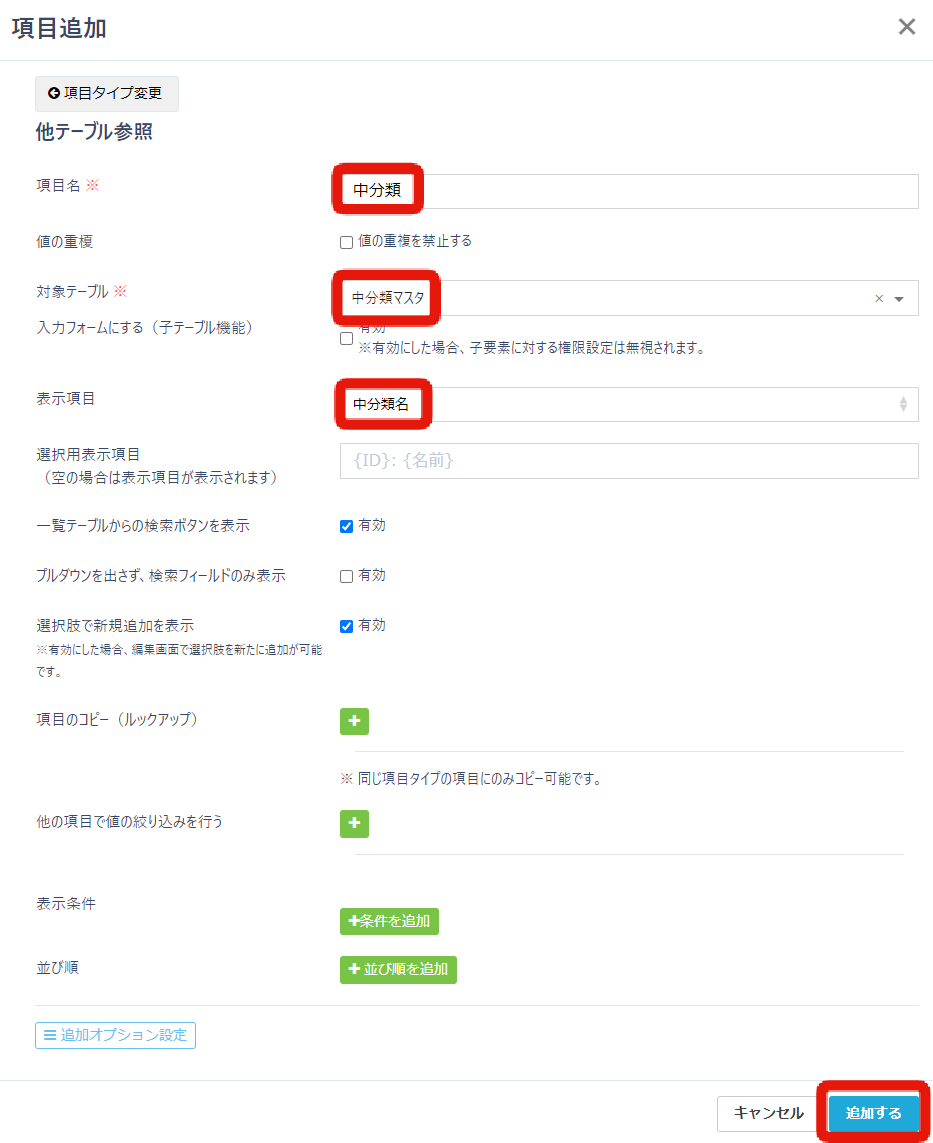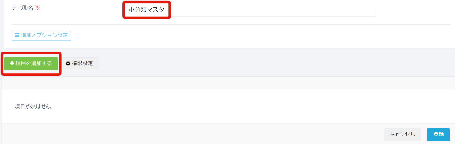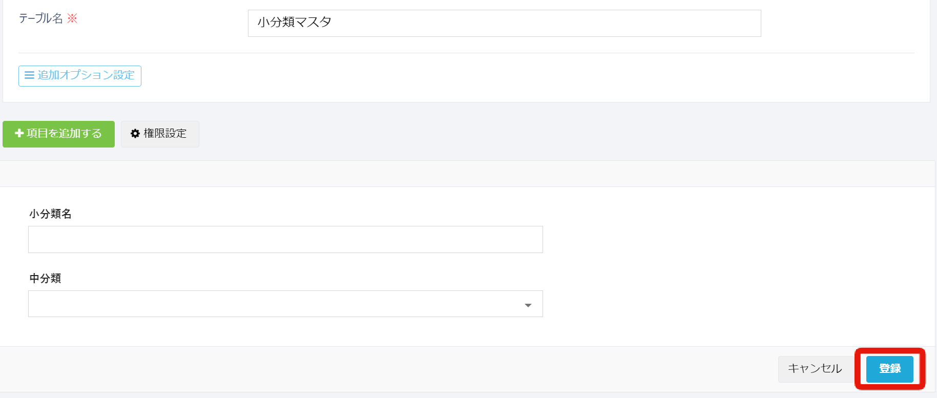 テーブル名に「小分類マスタ」、「項目を追加する」をクリック。