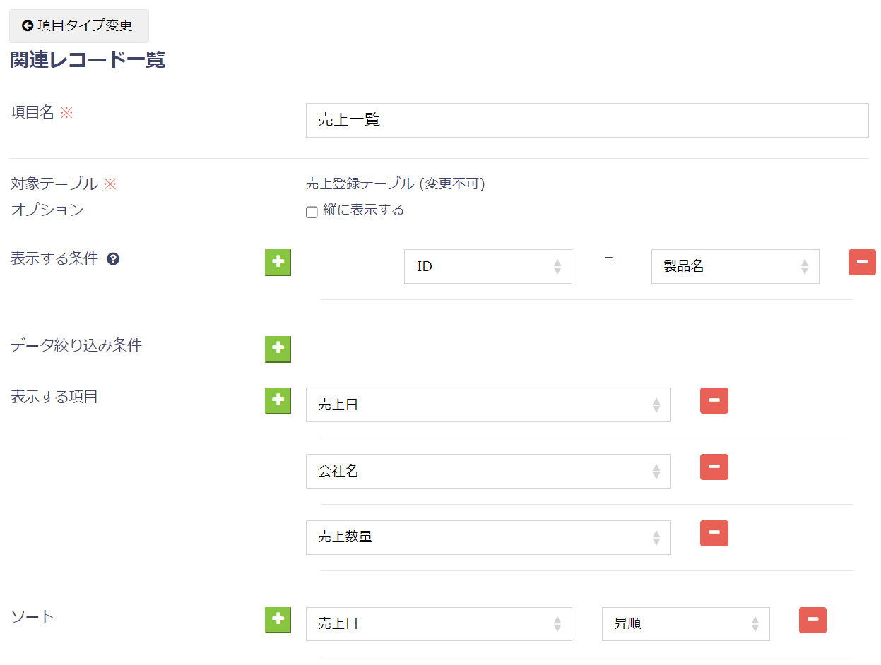 | ①売上一覧 | 関連レコード一覧 | 表示する条件:ID=製品名 表示する項目:売上日、会社名 ソート:売上日 昇順 |