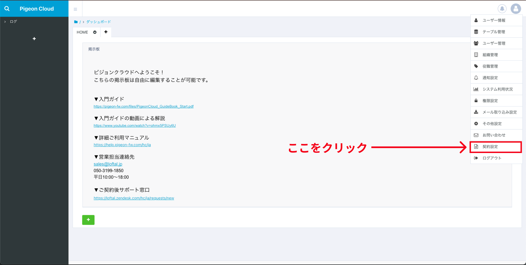 メニュー内の下部にございます「契約設定」をクリックしてください。