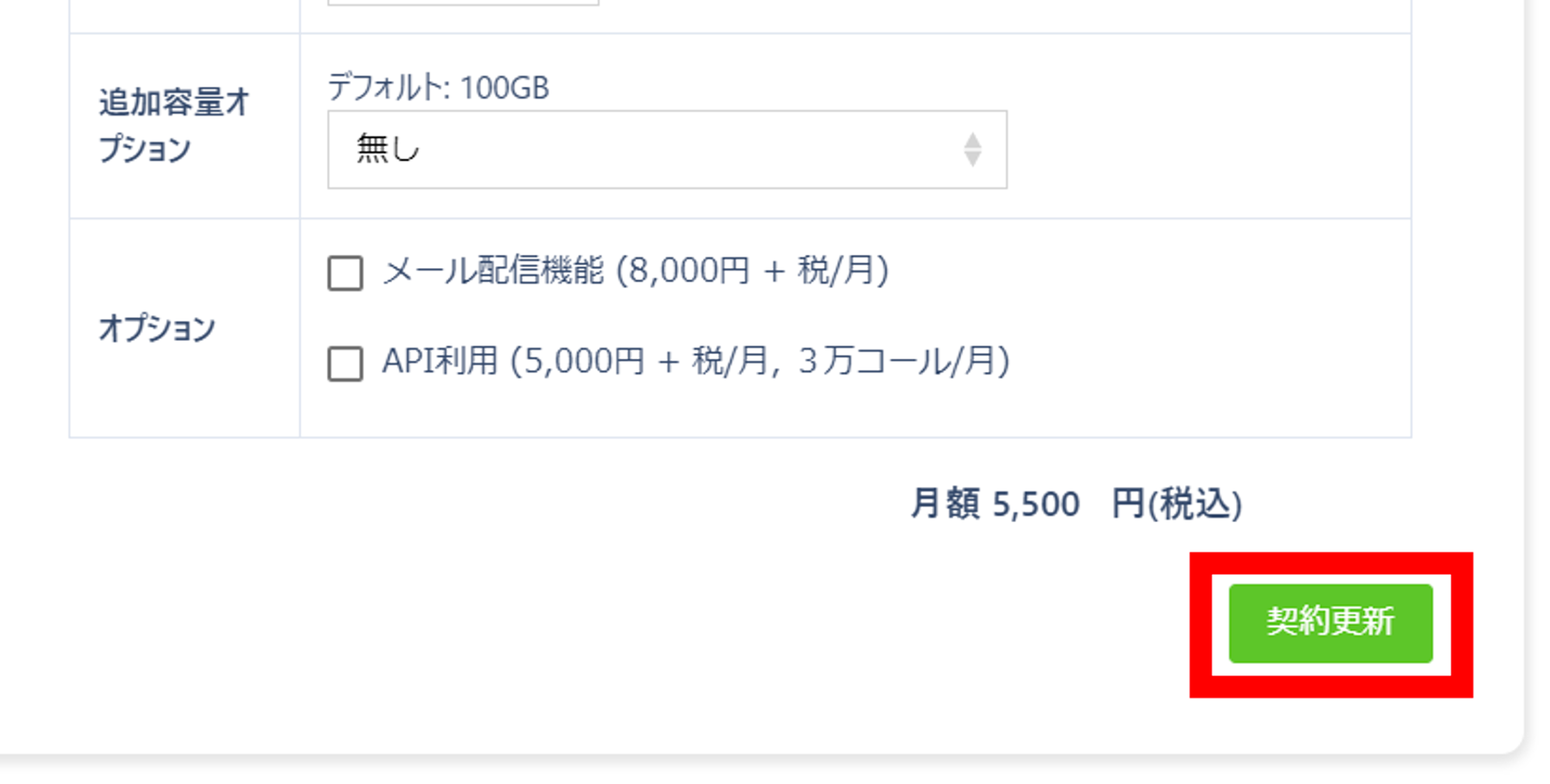契約内容は変更せず、「契約更新」という緑のボタンをクリックしてください。