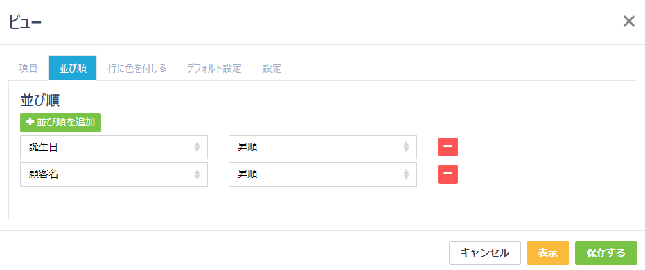 ビューを作成すると、テーブル一覧画面や詳細画面、編集画面での項目の表示/非表示の切り替え、及び並び替え、行に色を付ける等の設定が可能です。