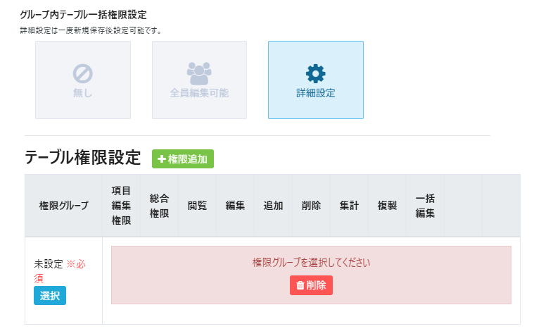 詳細設定をクリックいただくと、画面下部に「テーブル権限設定」という欄が表示されます。
