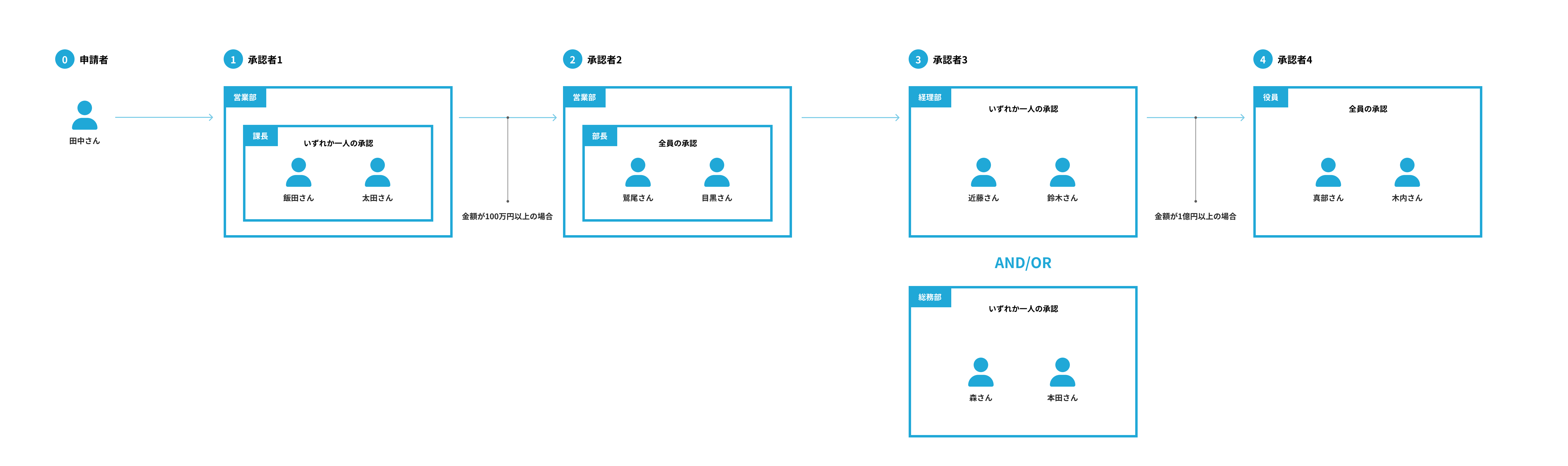 「承認者3」から「承認者4」に対して、「金額が1億円以上の場合のみ申請する」という条件を設定した場合の動作は以下のとおりです。