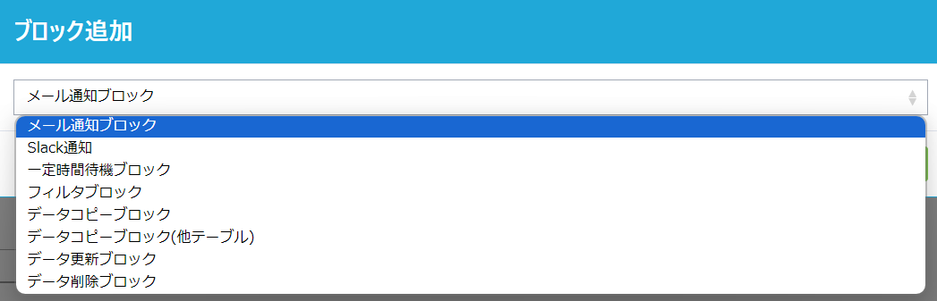 | メール通知ブロック | メール通知を行います。TO、CC、BCC、件名、メッセージを指定できます。 |