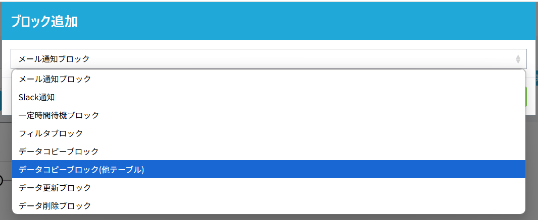 「ブロック追加」ボタンから、「データコピーブロック(他テーブル)」を選択して追加します。