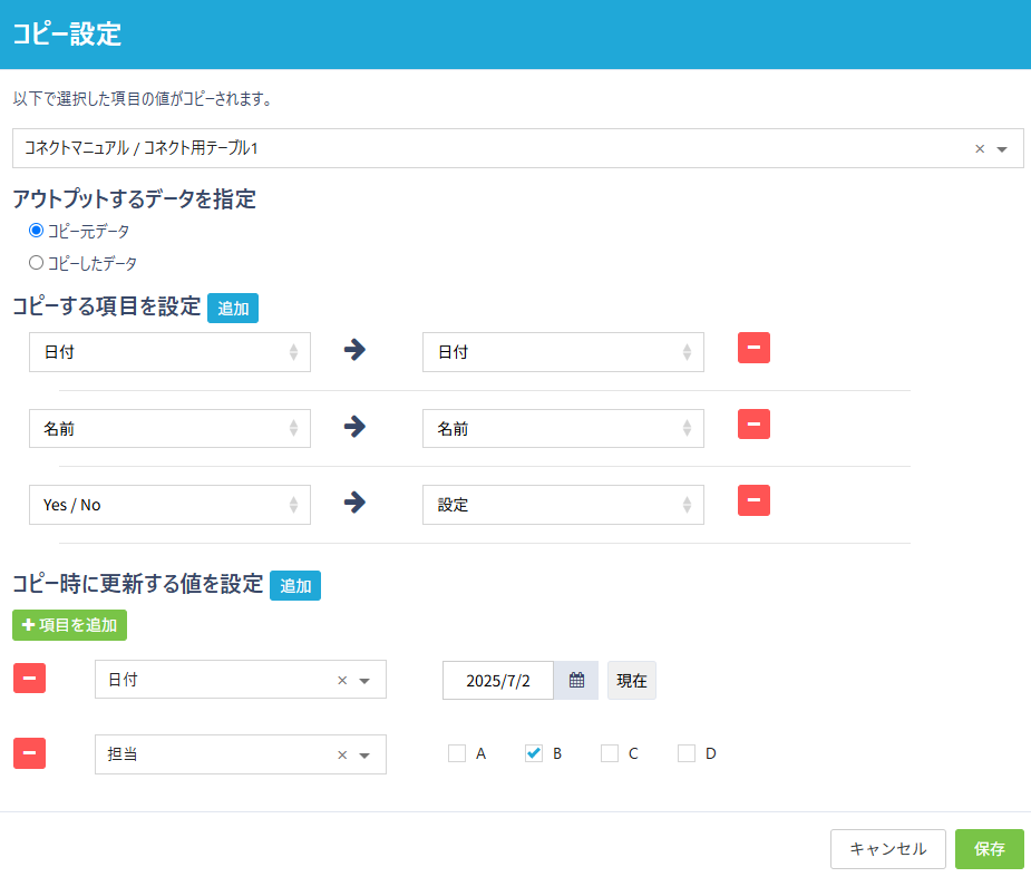 コピー先テーブルを指定し、必要に応じて「アウトプットするデータを指定」「コピーする項目を設定」「コピー時に更新する値を設定」の選択を行い、保存ボタンをクリックします。