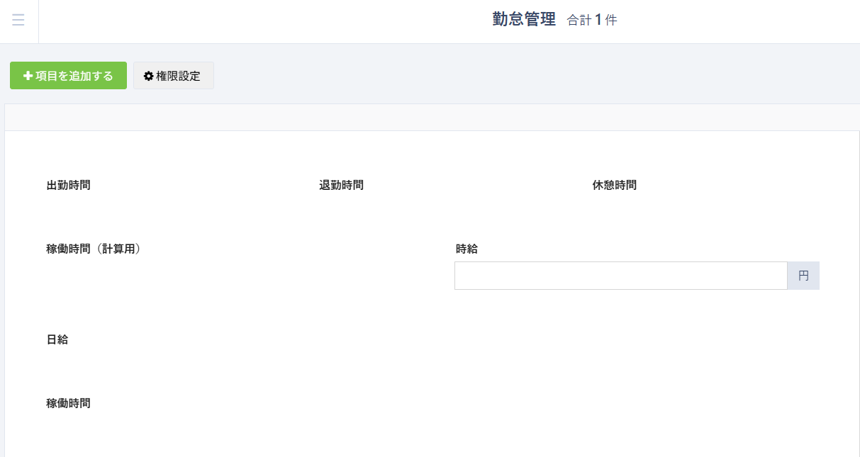 | ⑥日給 | 計算(計算値の種類:数値 数値の形式:整数) | 計算式:{稼働時間(計算用)}*{時給}※「計算値の自動更新」OFFのチェックを外す。 |