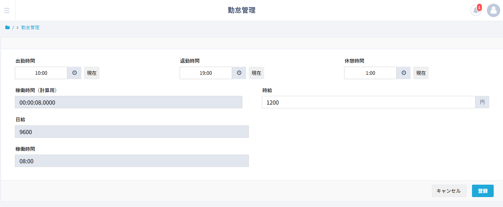 例:10:00~19:00勤務、1時間休憩、時給1200円の作業員の場合