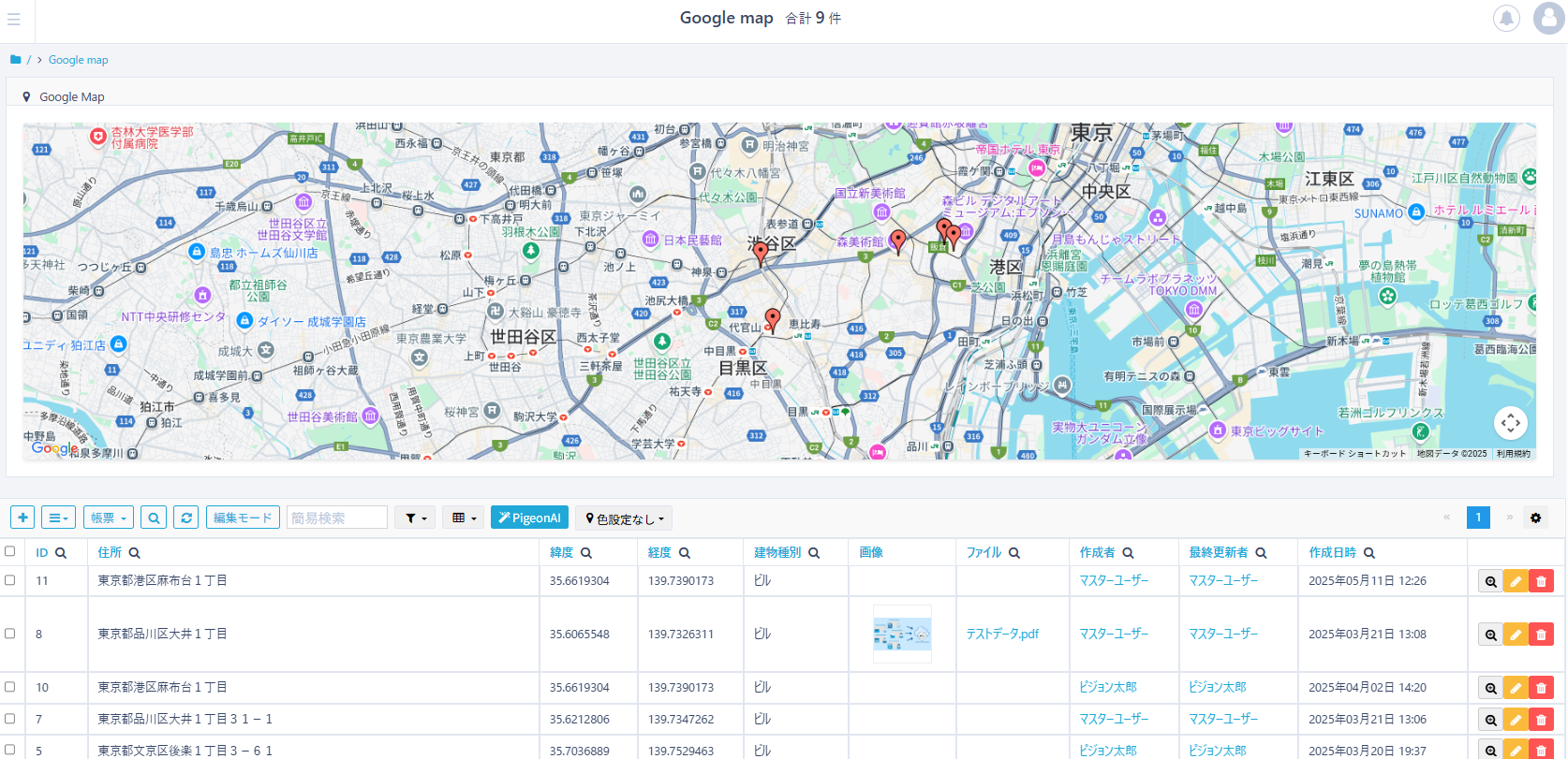 CSVアップロードで住所を取り込むと、緯度経度が自動で取得されます。