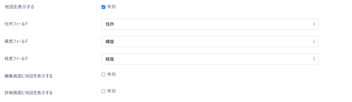 ※一覧画面への地図表示は「一覧画面に地図を表示する」、編集画面への地図表示は「編集画面に地図を表示する」、詳細画面への地図表示は「詳細画面に地図を表示する」でそれぞれON/OFFを切り替えることができます。