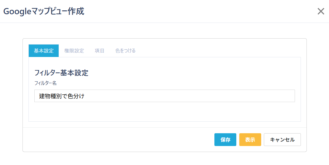 ⑥すべての設定が完了したら、右下の「保存」ボタン(ビューを保存しない場合は「表示」ボタン、ビューの作成を中断する場合は「キャンセル」ボタン)をクリックしてください。