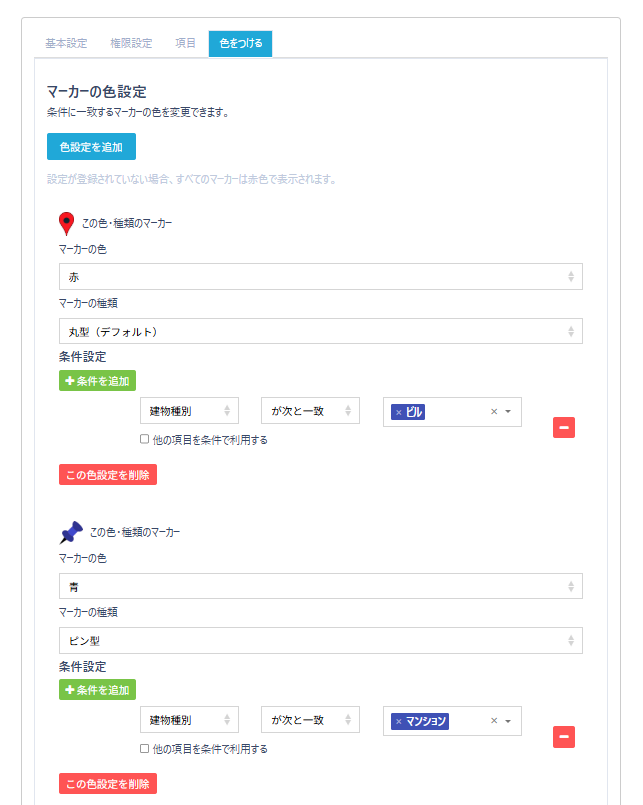 ⑤「色をつける」タブで、「色設定を追加」ボタンをクリックし、条件を設定して、ピンの色や種類を指定することが可能です。複数の設定が可能です。